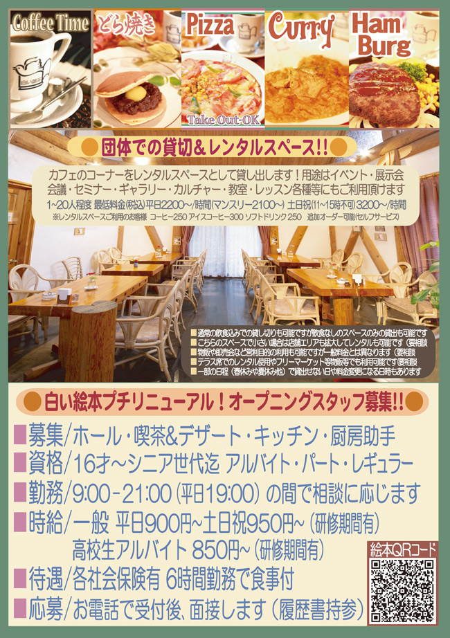 ![]() Cafe&Rest 白い絵本 〜Petit Cafe〜 〒669-1349 兵庫県三田市大川瀬886-1 お問合わせ・御予約 【TEL】079-568-2456 【E-mail】info@shiroiehon.main.jp 【Web-site】 http://shiroiehon.main.jp/ 平日 am9:00〜pm7:00 土・日・祝 am8:00〜pm9:00 平日の月曜のみ3:00閉店(不定期で月曜定休) |